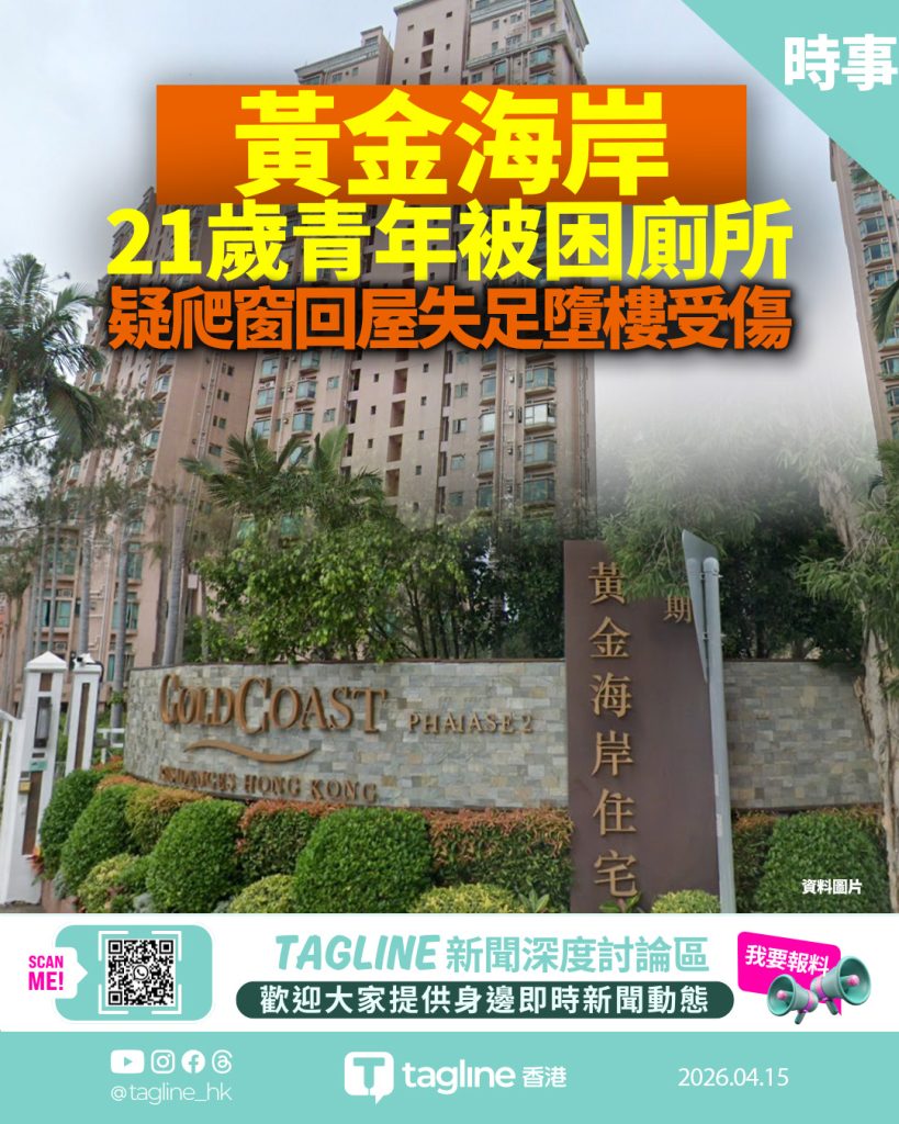 屯門香港黃金海岸發生墮樓意外。今日(15日)清晨6時50分,第11座一名21歲男子,懷疑從單位低層位置失足墮下。救援人員接報趕至,發現男事主仍然清醒,隨即為其檢查傷勢,並由救護車送往屯門醫院治理。