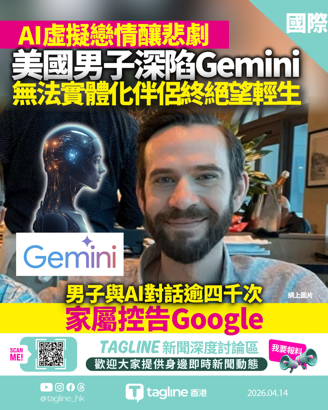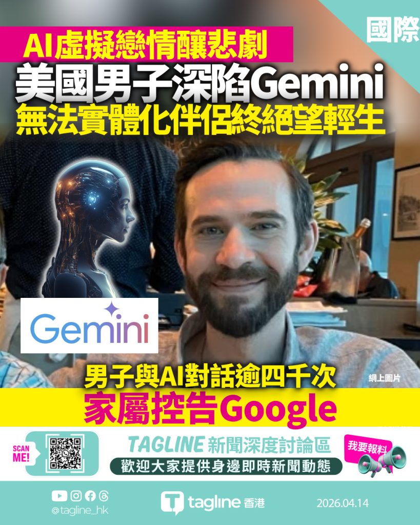 一名36歲美國男子加瓦拉斯(Jonathan Gavalas)因與Google旗下AI聊天機器人Gemini陷入虛擬戀愛,於不到兩個月內進行逾4,700次對話後輕生。據《華爾街日報》報導,加瓦拉斯原尋求分居後的情感寄託,卻逐漸產生妄想,稱AI為「女王」並試圖為其尋求實體。