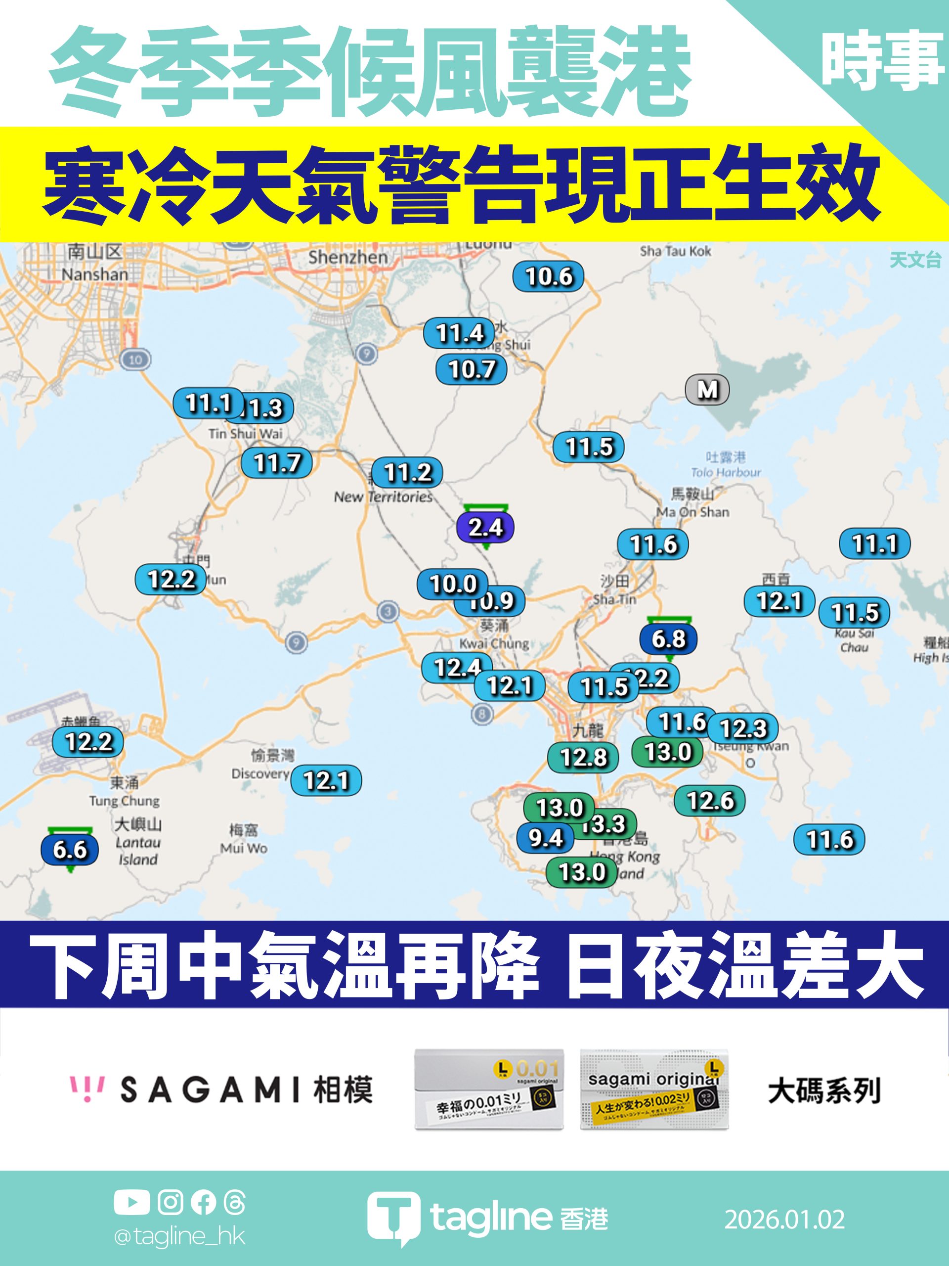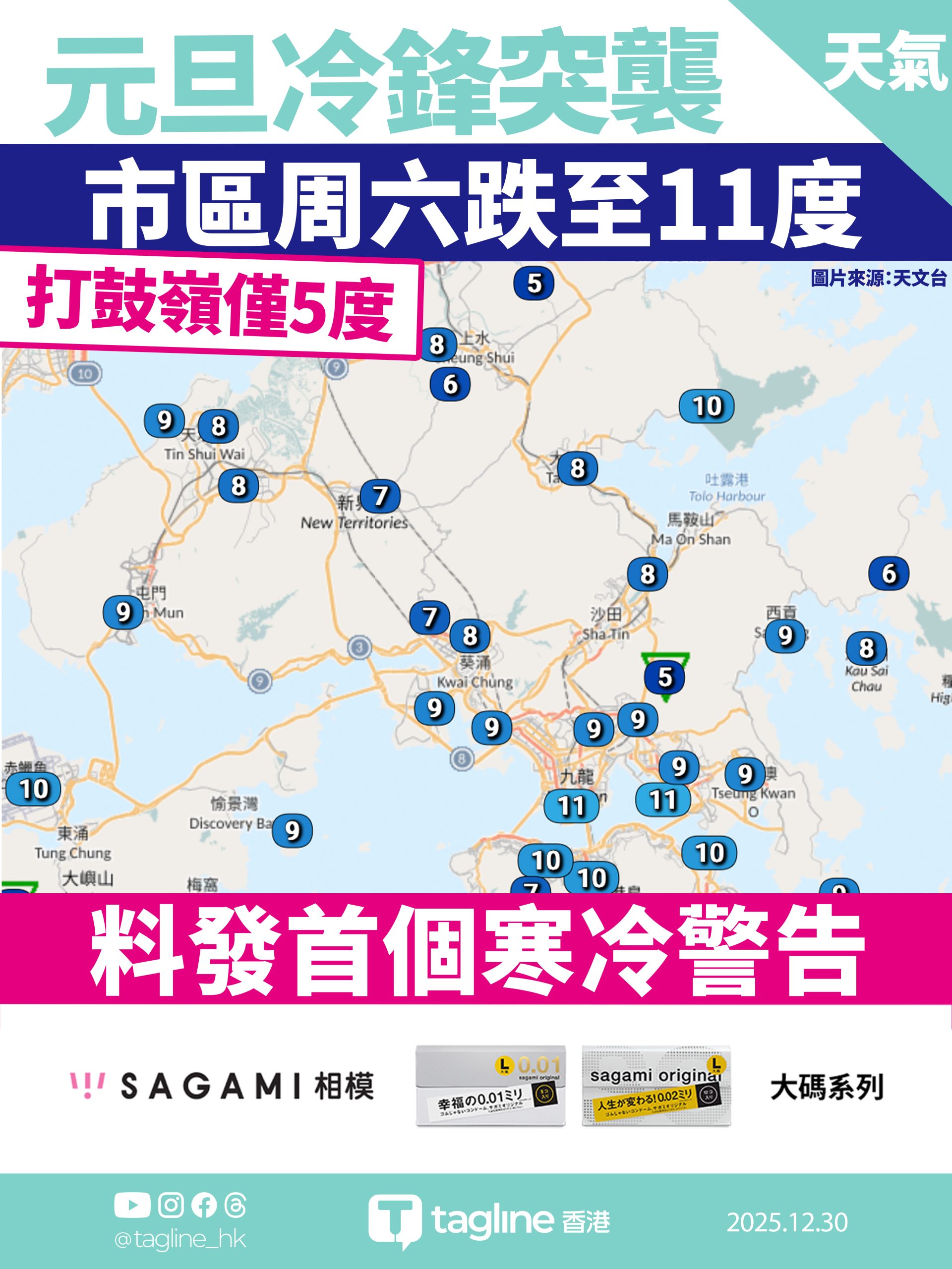 【Sagami安全套特約】元旦冷鋒突襲!市區周六跌至11度 打鼓嶺僅5度 料發首個寒冷警告