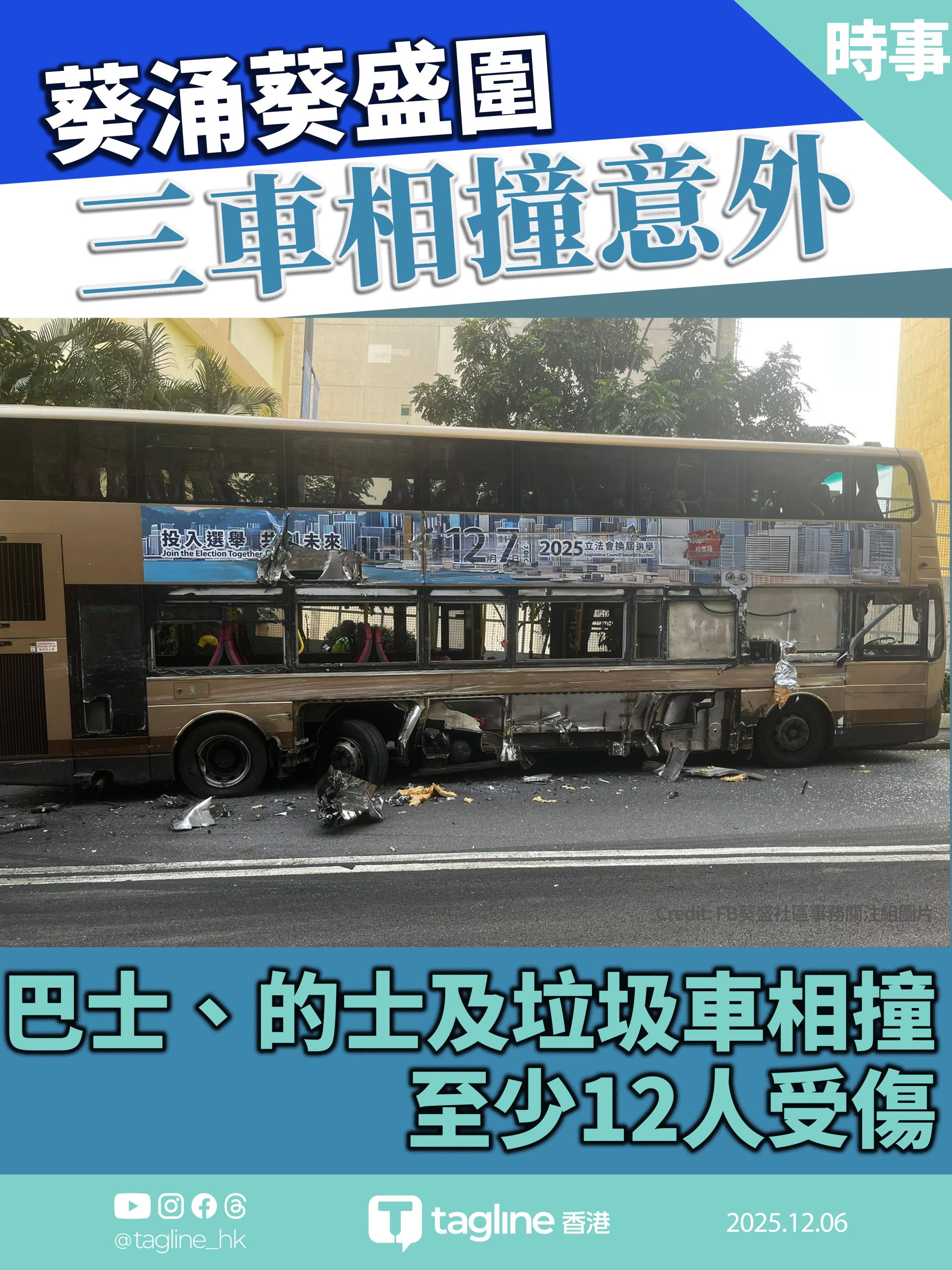 葵涌葵盛圍三車相撞意外 巴士、的士及垃圾車相撞 至少12人受傷