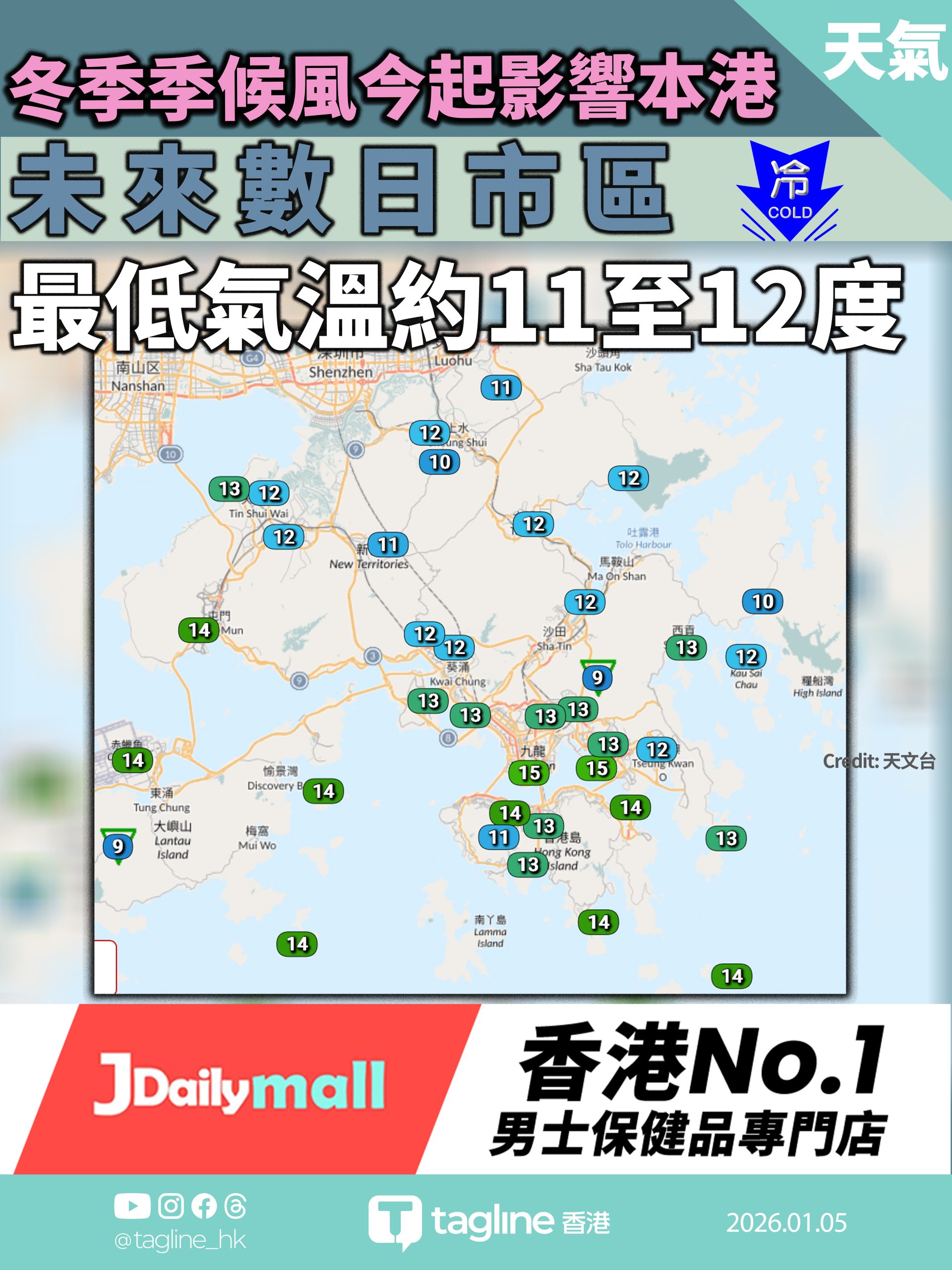 【Jdaily 男士保健品專門店特約】冬季季候風今起影響本港 未來數日天氣轉冷 市區最低氣溫約11至12度