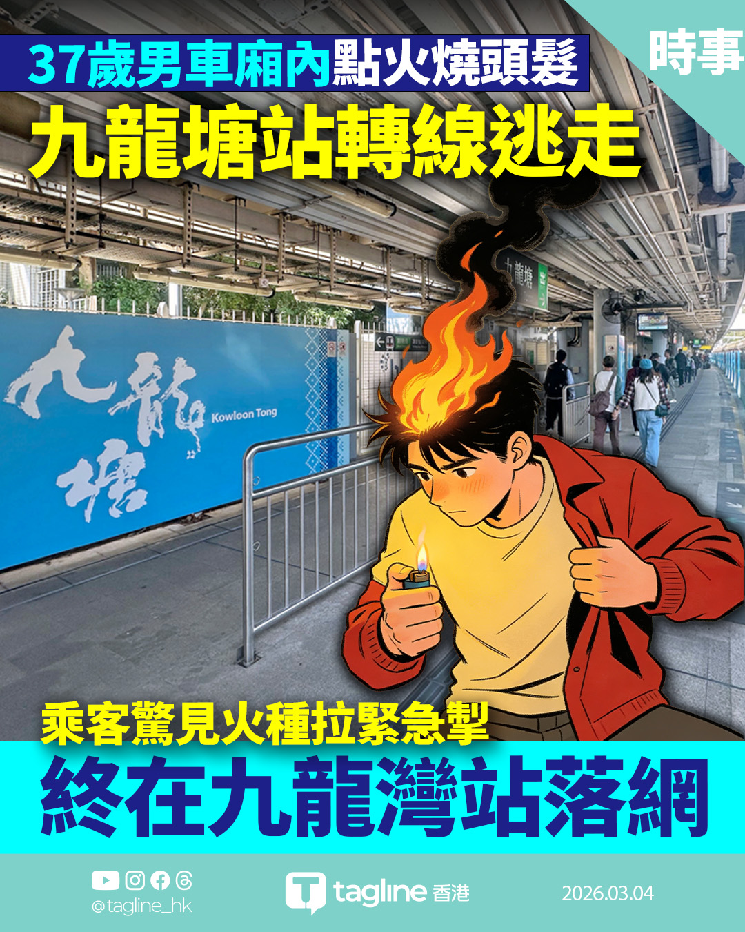 37歲男車廂內點火燒頭髮 乘客嚇煞拉緊急掣 警九龍灣站截獲送院